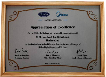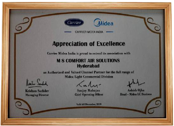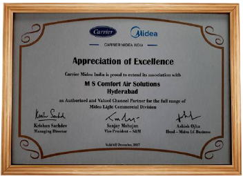 2011-we have been change the organisation to MS Comfort air solutions and started multi branded commercial air conditioning with Carrier & Midea,we have done many projects in Carrier & midea, specially Ductable and Cassette acs, Carrier midea awarded for Light commercial products in 2012 a Highest sales in south ,we have done Rate contract with many of the banks,maorly SBI for 3 years period unanimously with Carrier midea & Voltas.
